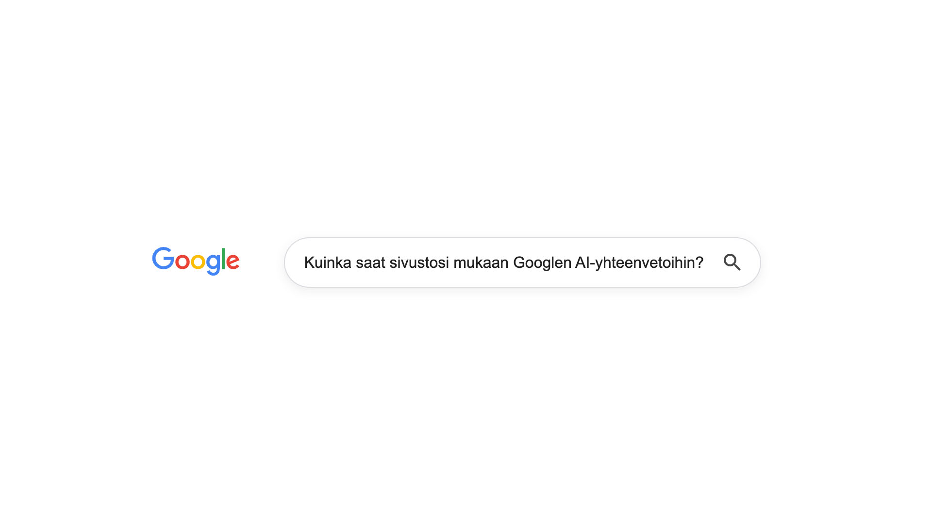Googlen algoritmit yksin päättävät luodaanko yhteenveto vai ei. Kun haluat selvittää näkyykö sivustosi AI-yhteenvedoissa, on siis ihan normaalia, jos yhteenvetoa ei näy yrityksen nimeä hakemalla. Vika ei ole sivustossasi. Yhteenvedot on tarkoitettu vastaamaan kysymyksiin ja helpottamaan monimutkaisten kokonaisuuksien ymmärtämistä.